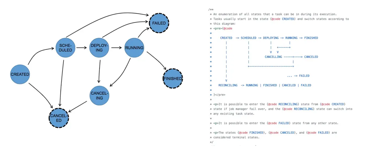 上图是作业的 Task 状态转换,需要注意的是,作业状态处于 running 状态时,并不意味着作业一定在运行消费信息。在流式计算中只有等所有的 task 都在 running 时,作业才算真正运行。