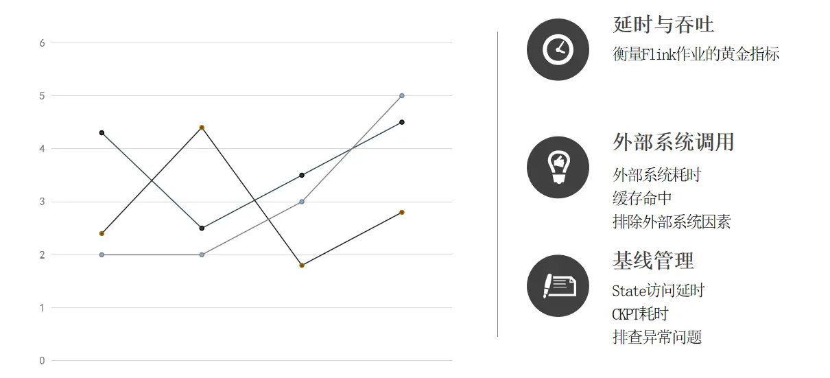 - 外部系统调用 从指标上还可以建立对外部系统调用的耗时统计,比如说维表 join,sink 写入到外部系统需要消耗多少时间,有助于我们排除外部的一些系统异常的一些因素。