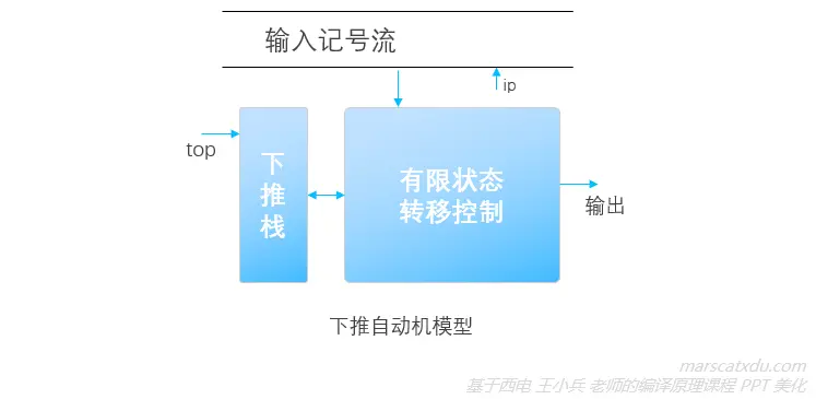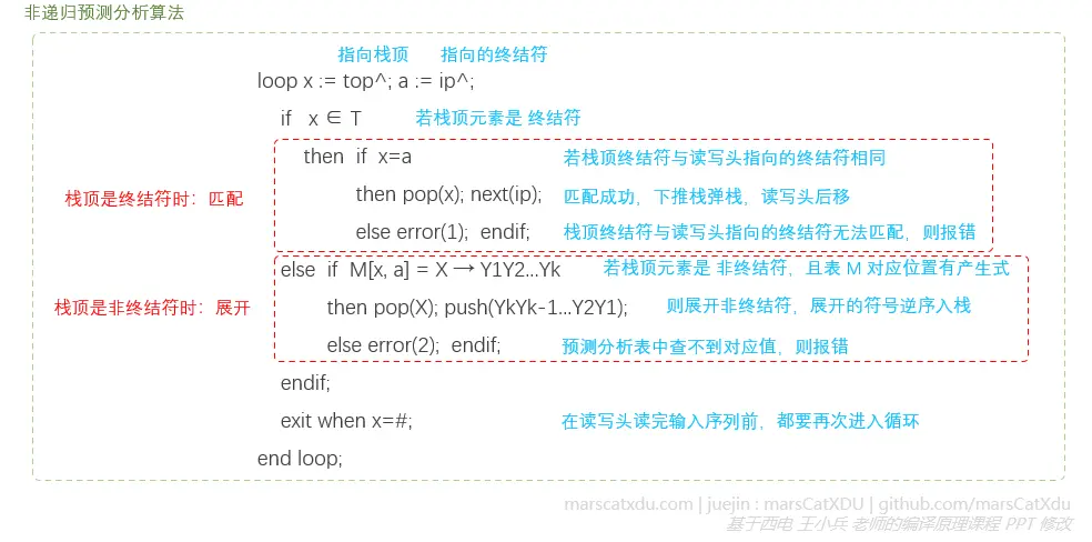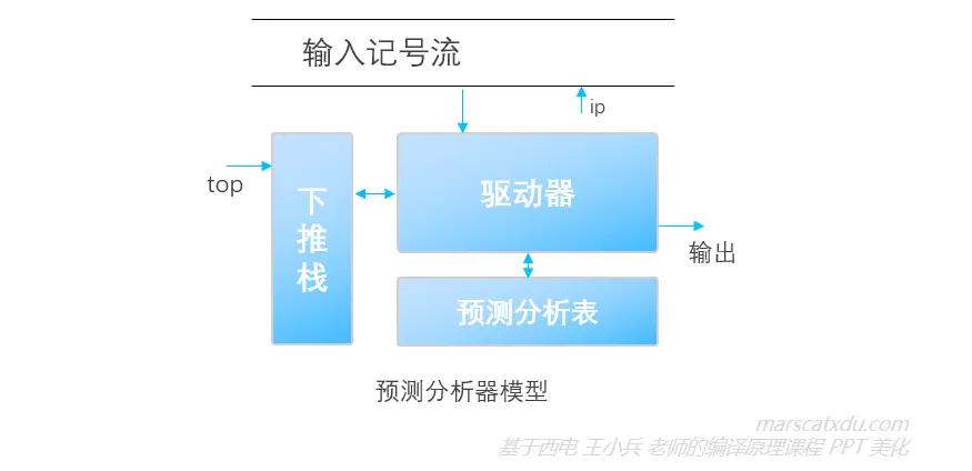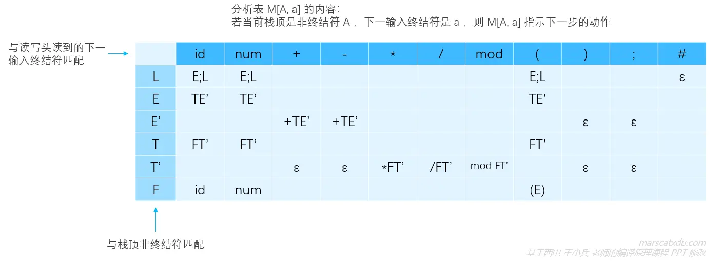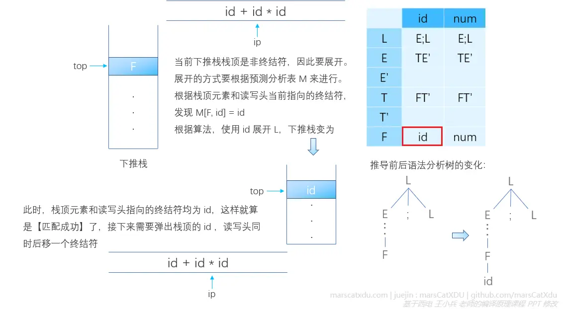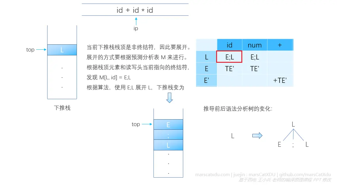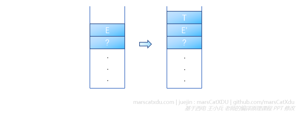 经过观察,我们发现除了这个产生式本身,只有第二行的 E → TE' 中出现了 E' 。通过观察这两个产生式,我们可以发现:下推栈中的 E' 只有一个来源,就是被使用 E → TE' 展开 E 而来。那也就是说,之前在下推栈中【位于 E 下面的非终结符】将被 E‘ “继承“