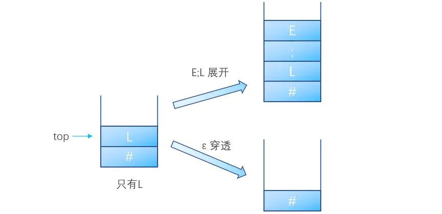 因为我们想要寻找的是在经过推导后跟在 L 后面的终结符,因此我们要首先扫一眼全部的产生式,看看 L 都在哪些产生式中出现过以获取线索。很不幸,只在第一个产生式中出现过……如果选择 E;L 进行推导将导致 L 的递归——也就是说若只用这个产生式进行推导,无论怎么推都永远推不出一个紧随 L (除了#之外)的终结符,最终还是要面对只有 L 的问题。而若选择 ε 展开 L 则会导致 L 的穿透,暴露出文法的结束符号 # ,因此 FOLLOW(L) = {#};