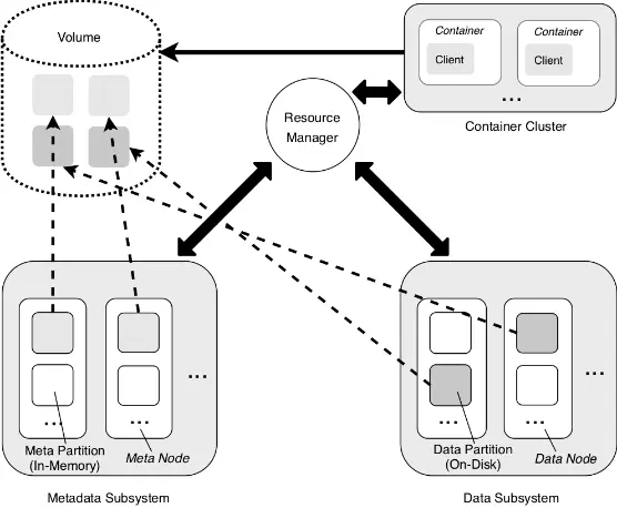 元数据子系统由元数据节点组成,每个节点可以管理一组元数据分片。 数据子系统由数据节点组成,每个节点管理一组数据分片。 在ChubaoFS中,卷是一个逻辑概念,由多个元数据和数据分片组成。从客户端的角度看,卷可以被看作是可被容器访问的文件系统实例。一个卷可以在多个容器中挂载,使得文件可以被不同客户端同时访问。一个ChubaoFS集群可以有上百个卷,大小从几GB至几TB不等。 概括来说,资源管理节点定期获取元数据和数据子系统信息,客户端则定期从资源管理器拉取元数据和数据分片信息,并且进行缓存。通常来讲,文件操作由客户端发起,直接与数据和元数据节点通信,无需资源管理节点介入。