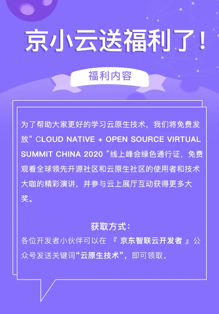 2020年7月30日-8月1日,2020 年 Cloud Native + Open Source Virtual Summit China 中国峰会将首次以线上形式召开。作为 CNCF 云原生基金会白金会员,继去年参与 KubeCon 后,今年京东智联云将继续在大会中亮相,不仅带来多场精彩演讲,还将通过京东智联云云上展厅,近一步展示京东云原生技术动态与前沿技术。
