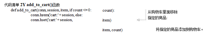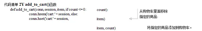 购物车的定义非常简单:每个用户的购物车都是一个散列,这个散列存储了商品ID与商品订购 数量之间的映射。对商品数量进行验证的工作由Web应用程序负责,我们要做的则是在商品的订购 数量出现变化时,对购物车进行更新:如果用户订购某件商品的数量大于0,那么程序会将这件商品 的ID以及用户订购该商品的数量添加到散列里面,如果用户购买的商品已经存在于散列里面,那么 新的订购数量会覆盖已有的订购数量;相反地,如果用户订购某件商品的数量不大于0,那么程序将 从散列里面移除该条目。代码清单2-4的add_to_cart()函数展示了程序是如何更新购物车的。