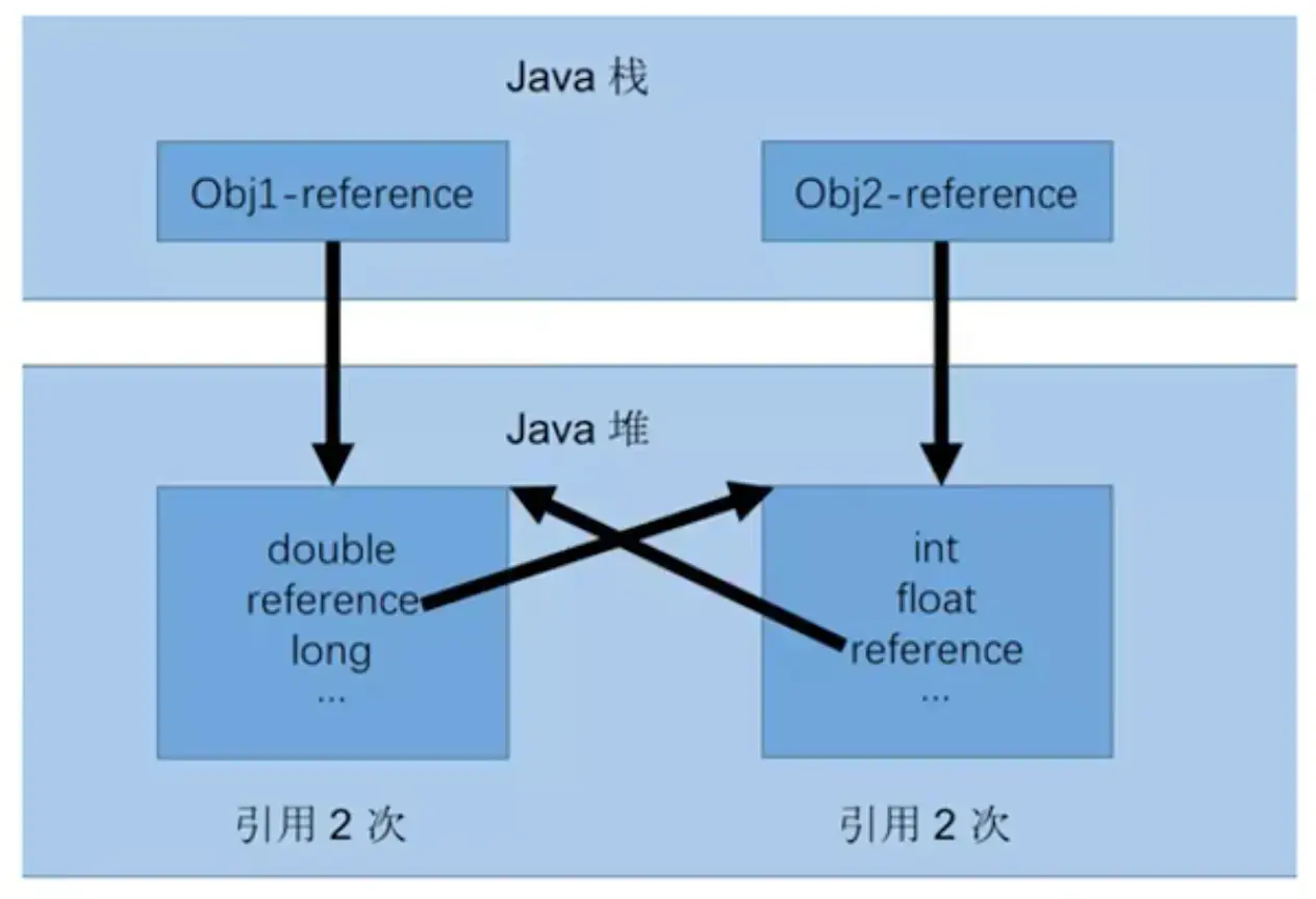 引用计数法的弊端:即使把obj1 一reference和obj2 一reference(栈引用)置null。 则在Java堆当中的两块内存依然保持着互相引用,无法回收。