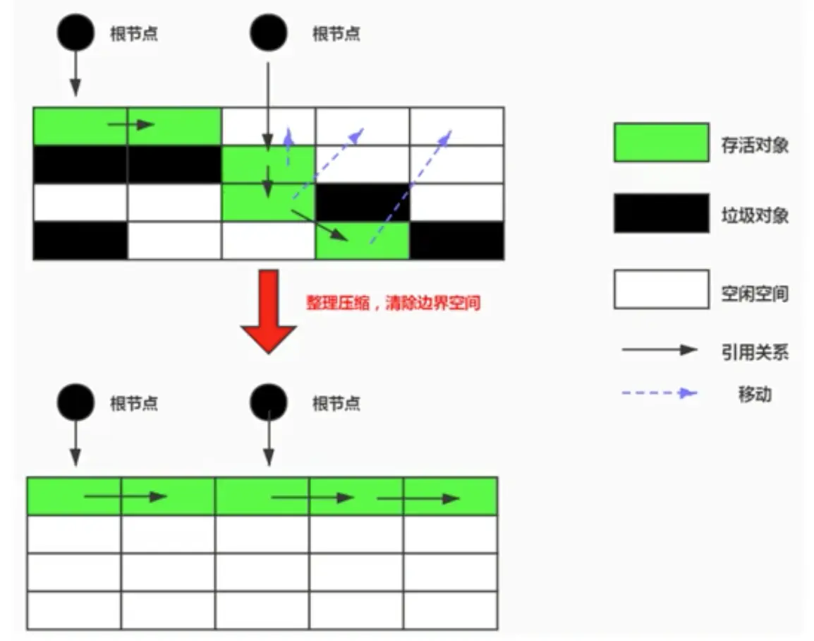可以看到,标记的存活对象将会被整理,按照内存地址依次排列,而未被标记的内存会被清理掉。如此一来,当我们需要给新对象分配内存时,JVM只需要持有一个内存的起始地址即可,这比维护一个空闲列表显然少了许多开销。