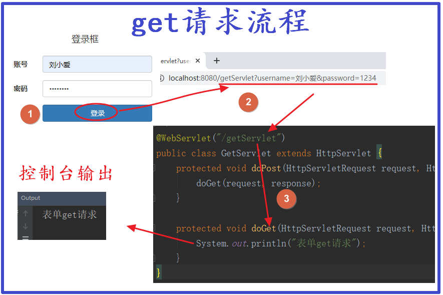 而在①中点击登录时会跳转“/getServlet”,所以会找到这个类,从而执行doGet()请求方法。