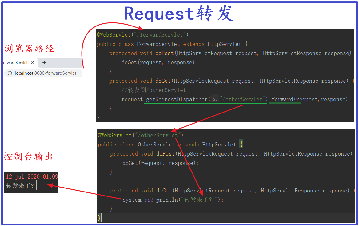 - getRequestDispatcher("/otherServlet"),参数即为需要转发到的路径。