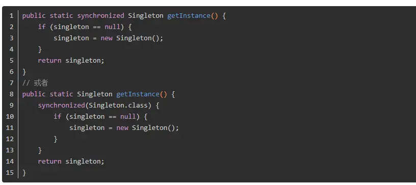 这个方法其实是存在问题的,试想一下,如果两个线程同时判断singleton为空,那么它们都会去实例化一个Singleton对象,这就变成双例了。所以,我们要解决的是线程安全问题