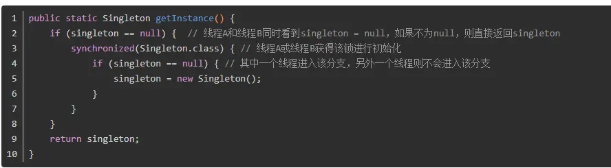 if (singleton == null) { // 线程A和线程B同时看到singleton = null,如果不为null,则直接返回singleton