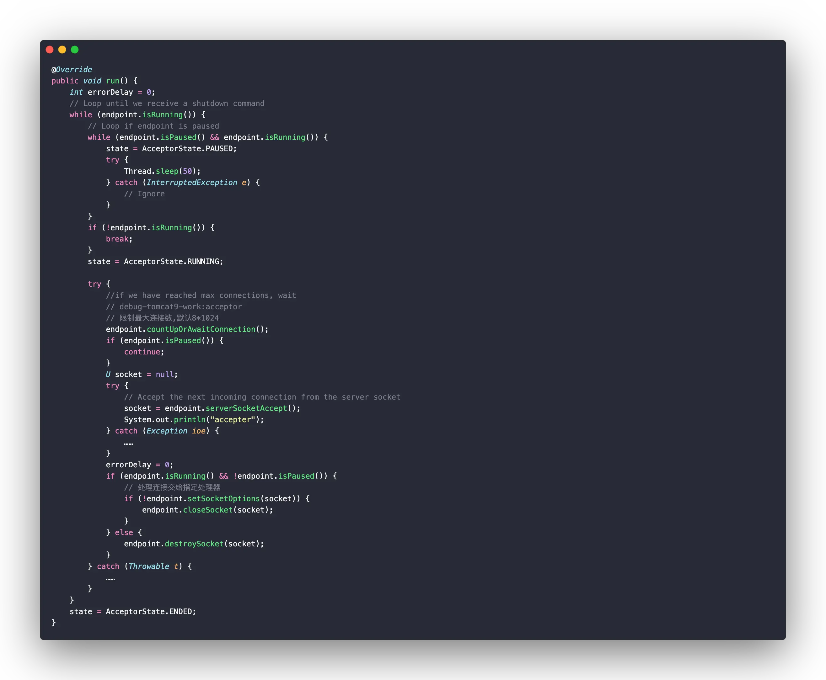 在上一节中我们讲到了连接器中比较重要的组件有Endpoint、Processor、Adapter,其中Endpoint中有负责监听socket连接的组件Acceptor和处理socket请求的组件SocketProcessor。首先看Acceptor,它实现了Runnable接口run()方法如下: