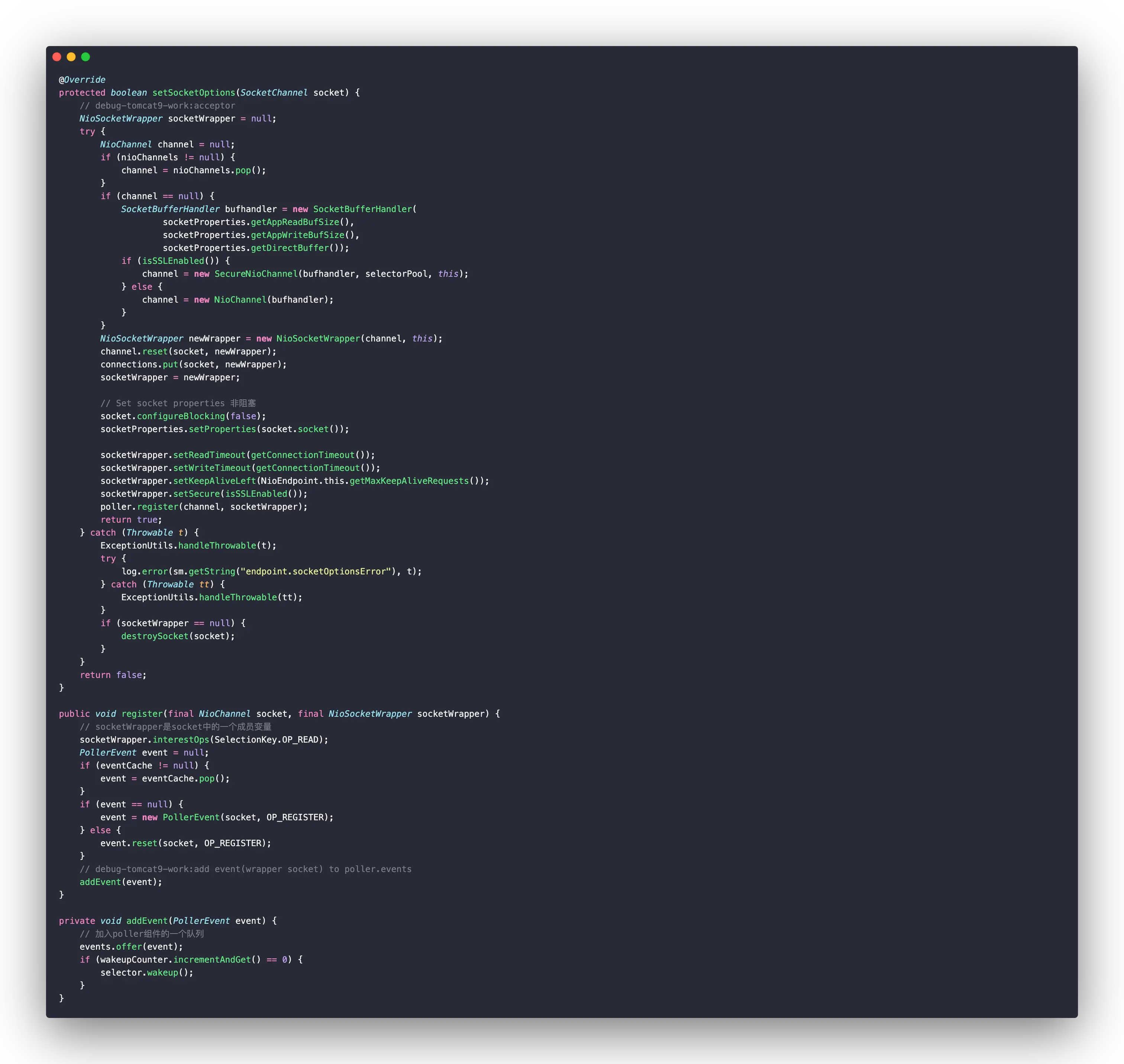 NioEndpoint.setSocketOptions()方法用来设置SocketChannel为非阻塞模式以及其他属性,生成一个NioChannel和NioSocketWrapper对象并设置属性,将SocketChannel、NioSocketWrapper设置为NioChannel的属性,SocketWrapperBase这个包装类是为了屏蔽不同I/O模式下的Channel类的差异,再将它们注册到Poller组件poller.register(channel, socketWrapper);也就是封装一个PollerEvent对象加入Poller组件的Queue里。