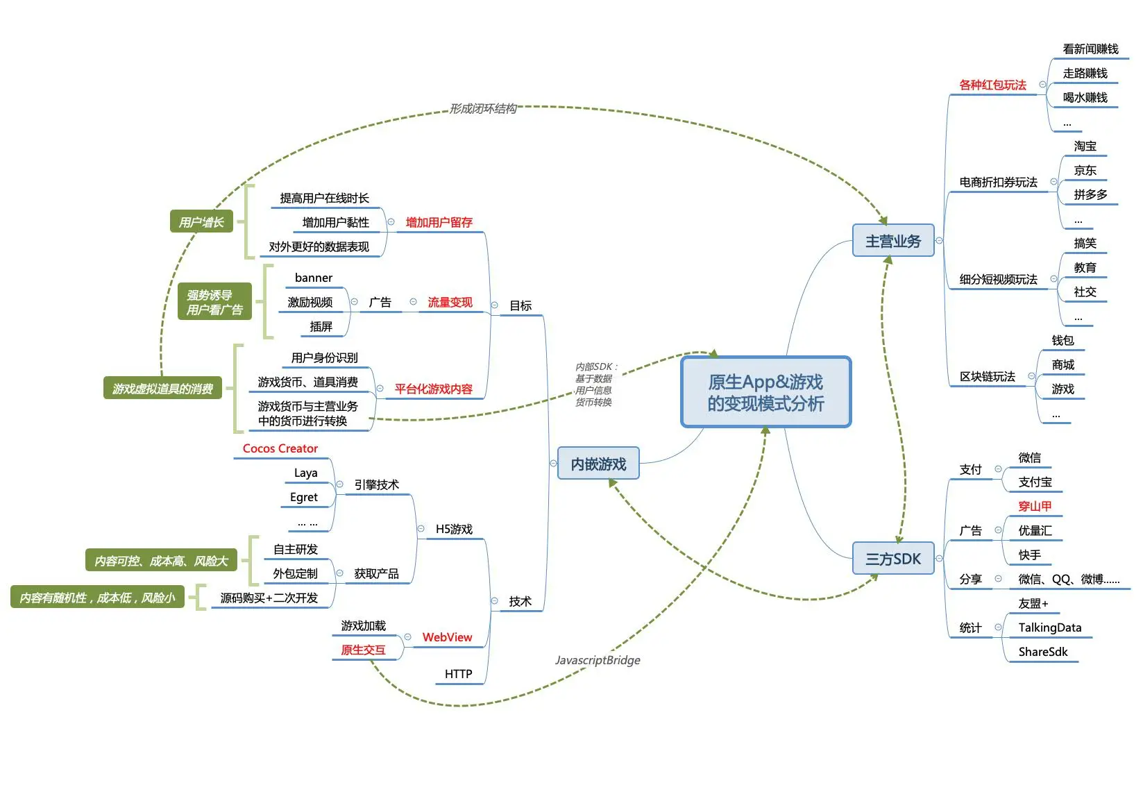 根据与客户之间的交流,我这里画了一张脑图,从客户目标、技术两个方面,分析了在原生App中嵌入游戏内容的价值与低本成本的实现方案。