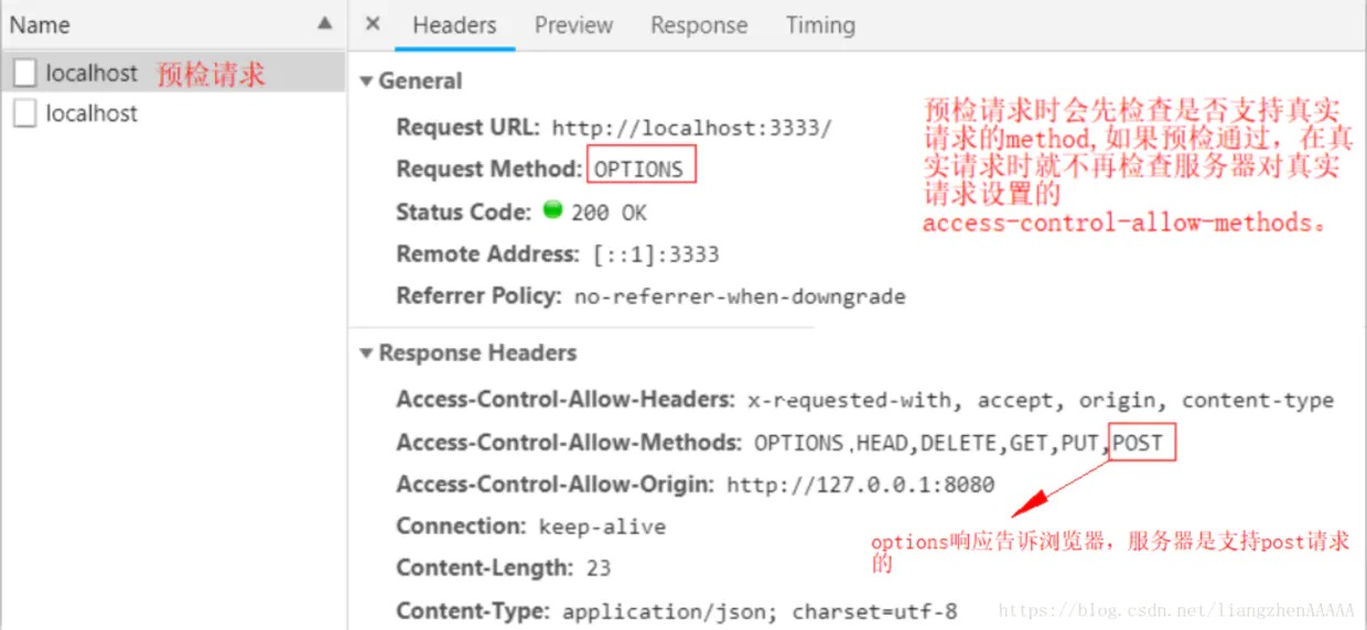 注意:如果通过,浏览器就继续向服务器发送真实请求,否则就会报预检错误。