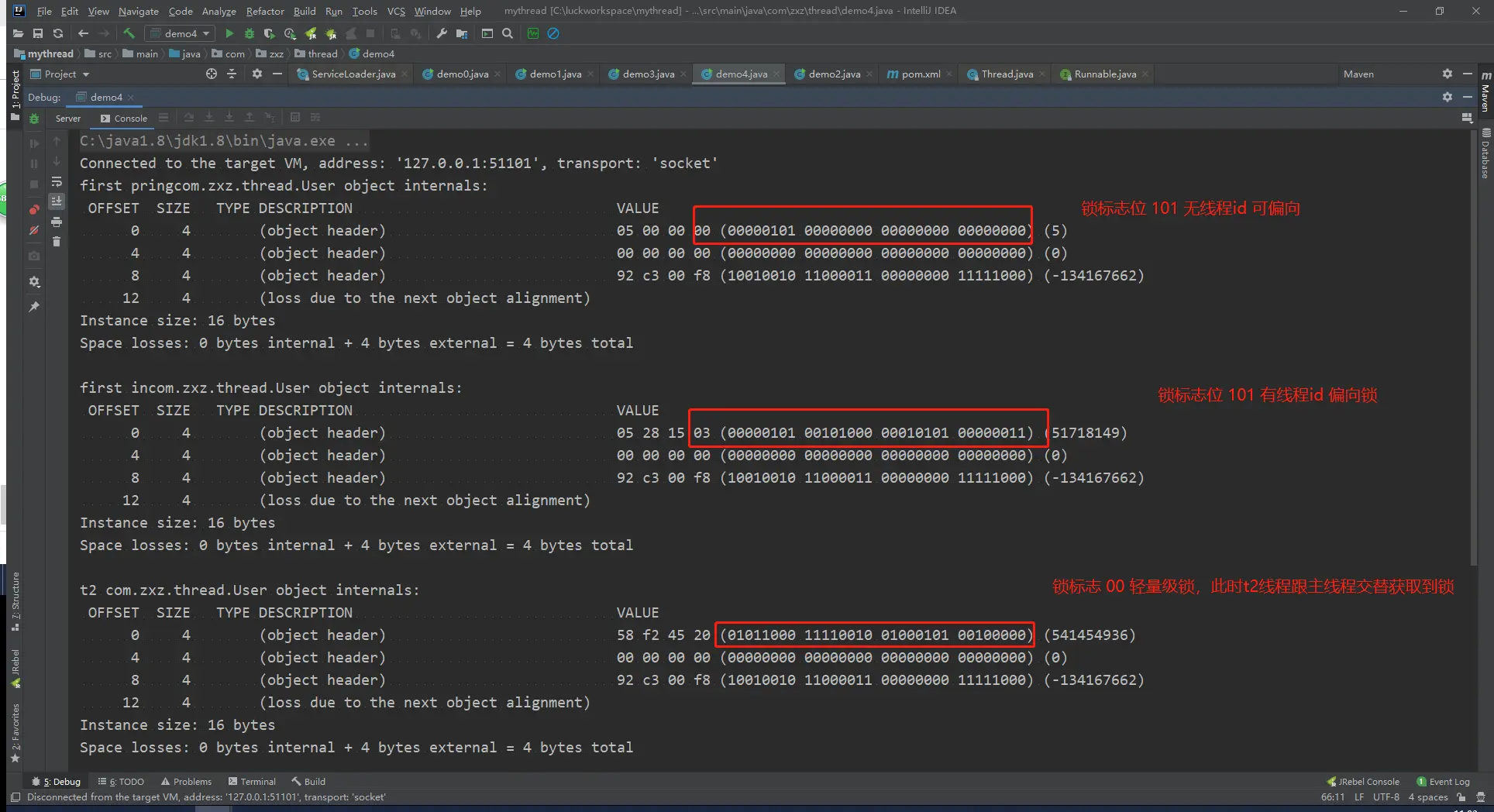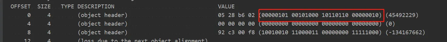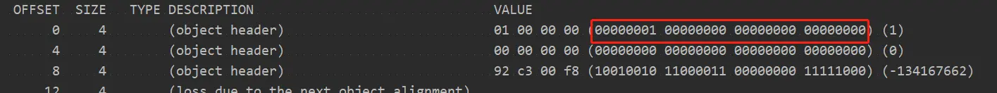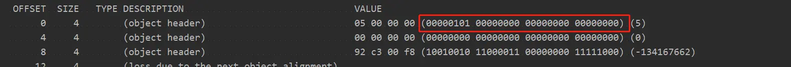 第一次打印:00000101 00000000 00000000 00000000 锁标志101 没有线程id,表示可偏向