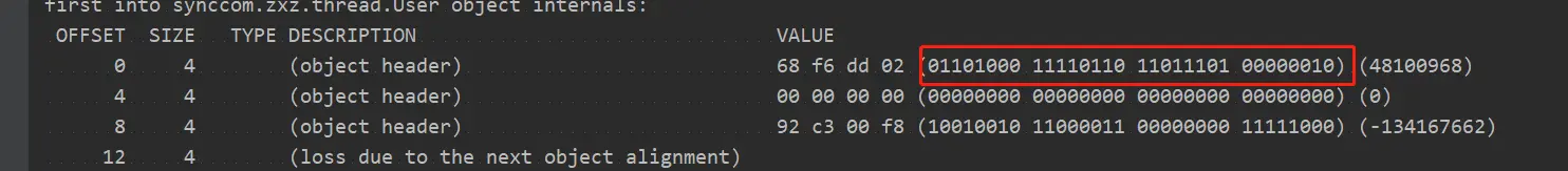 System.out.println("first into sync" + ClassLayout.parseInstance(user).toPrintable());