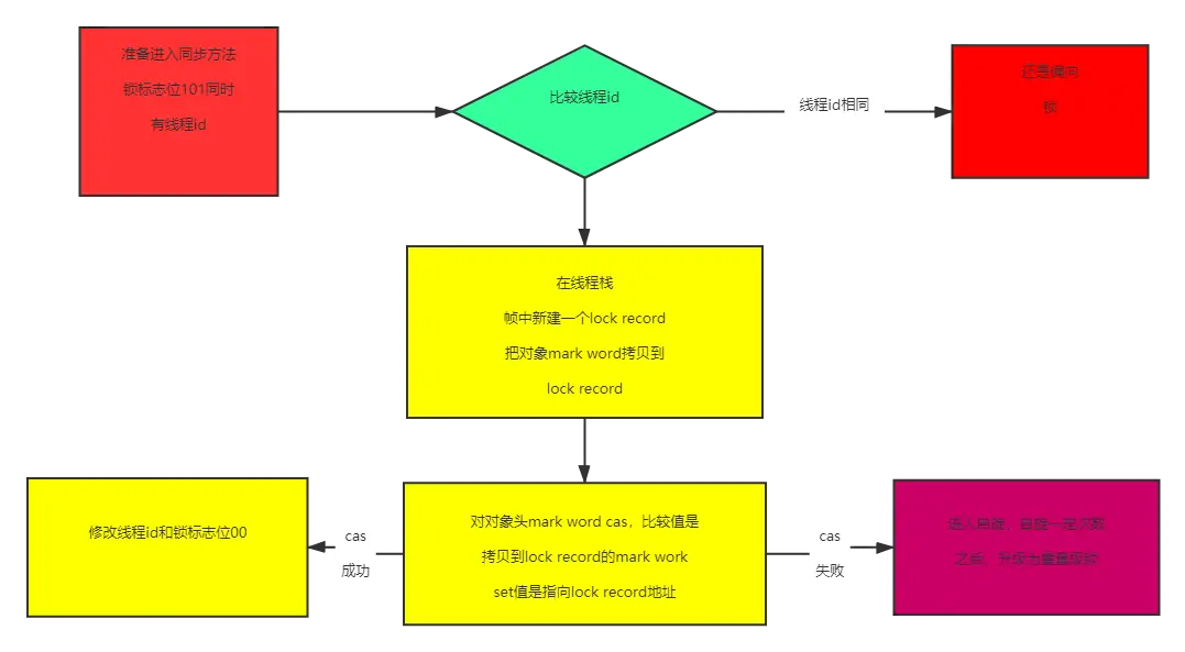 顾名思义,偏向,偏心,偏向线程,当只有一个线程访问同步代码的时候,即是偏向锁,每次要执行同步代码的时候,都会先判断线程id是否一致,如果一致就直接进入同步块