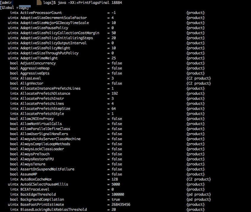 - java -XX:+PrintFlagsFinal pid