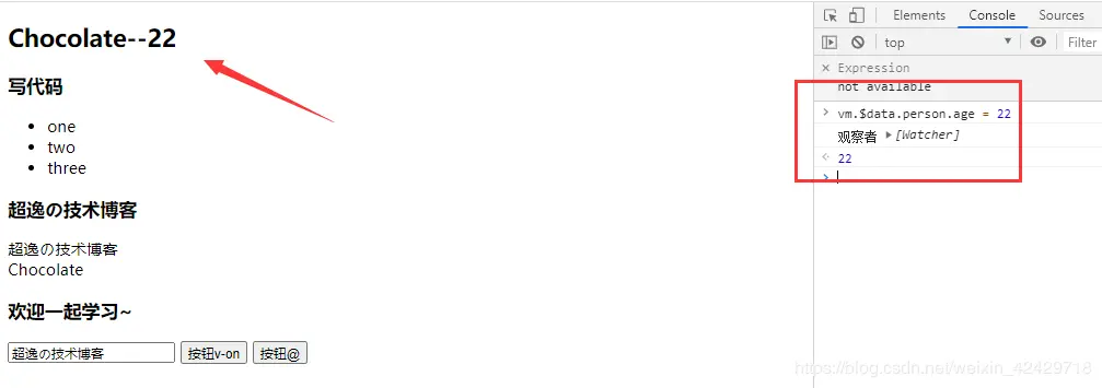 此时,我们就能通过数据变化来驱动视图了,例如更改我们的年龄 age 从原来的 20 设置为 22,如下图所示,发现数据更改, watcher 去更新了视图。