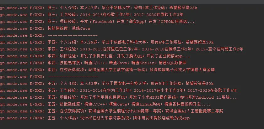 Log.e(TAG, name + ",个人介绍:" + "本人33岁,毕业于西安电子科技大学,现有9年工作经验,希望薪资是50k");