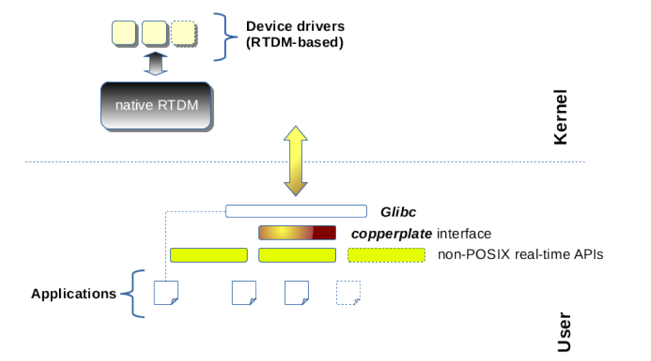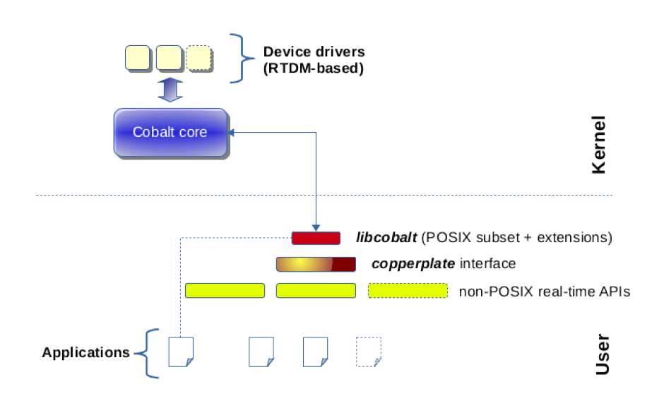 - cobalt :添加一个实时核,双核结构,具有实时内核cobalt、实时驱动模型RTDM、实时应用POSIX接口库libcobalt,基于libcobalt的其他API skins,如Alchemy API、VxWorks® emulator、pSOS® emulator等。