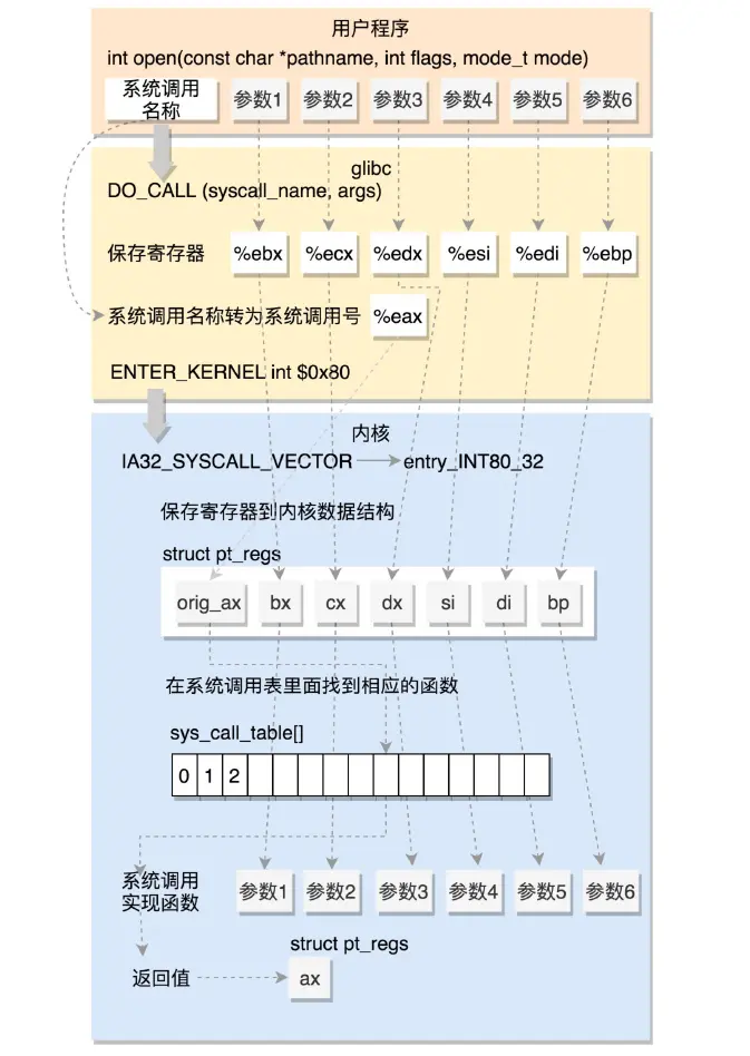 在这里,将系统调用号从pt_reges中eax 里面取出来,然后根据系统调用号,在系统调用表中找到相应的函数进行调用,并将寄存器中保存的参数取出来,作为函数参数。如果仔细比对,就能发现,这些参数所对应的寄存器,和 Linux 的注释是一样的。ia32_sys_call_table系统调用表生成后面解析(此图来源于网络)。