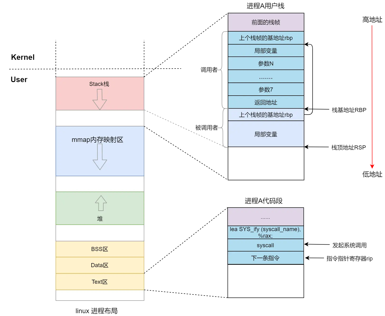 linux内核中设置了一组用于实现系统功能的子程序,称为系统调用。系统调用和普通库函数调用非常相似,只是系统调用由操作系统核心提供,运行于内核态,而普通的函数调用由函数库或用户自己提供,运行于用户态。