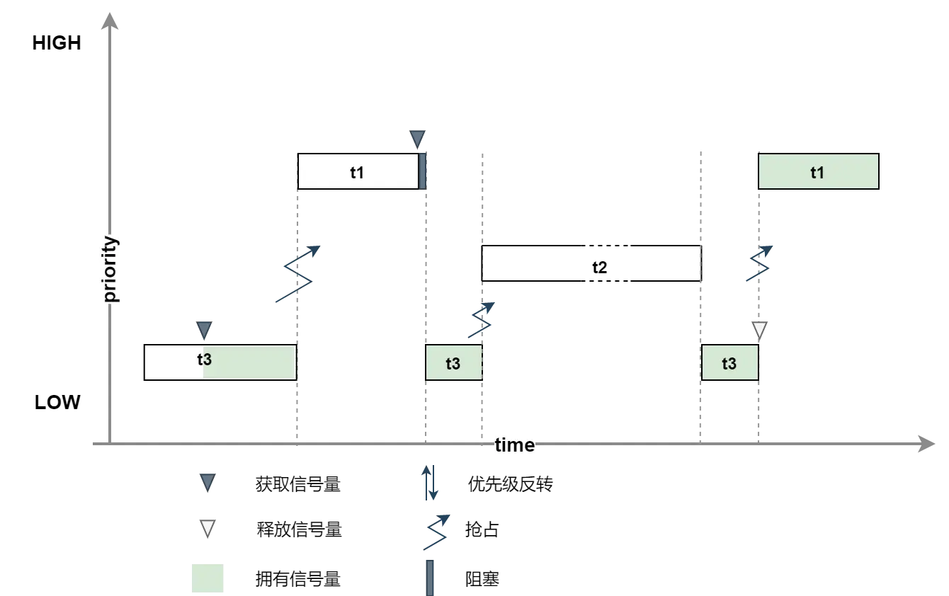在基于优先级调度下,会出现下面情况(例子中的信号量为二值信号量与互斥量等效).