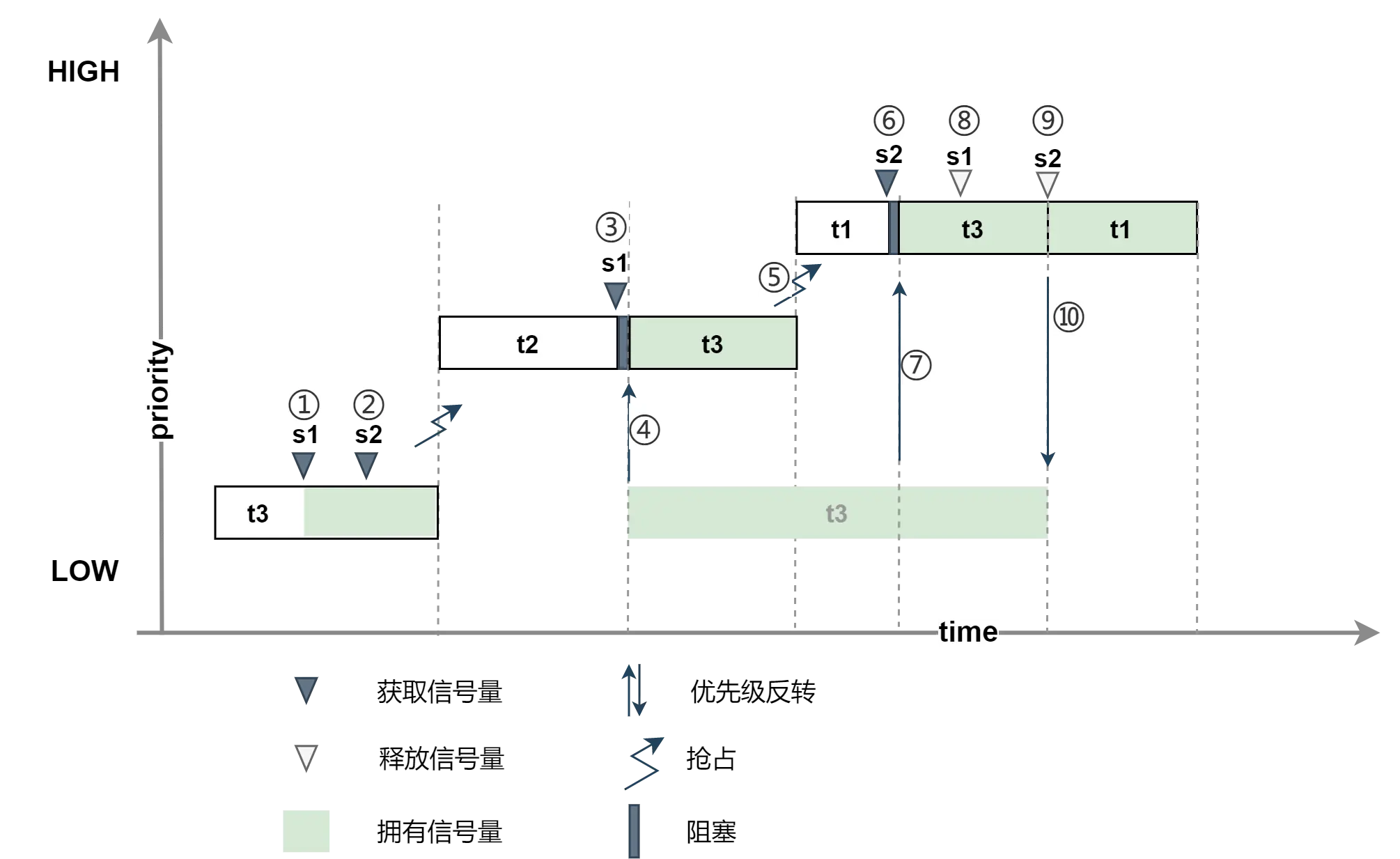 ① 低优先级为10的任务t3获取信号量s1;