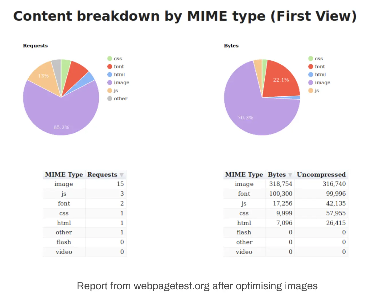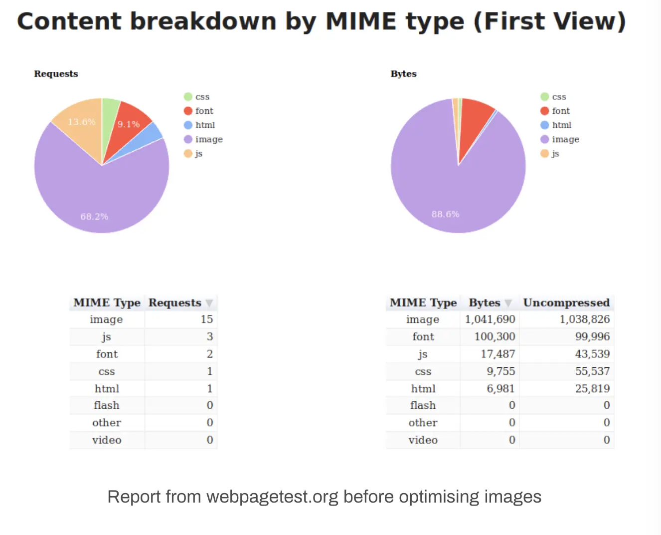 在我的网站上,我注意到我的主页页面重量超过1.1 MB,图片占了其中的88%。我也意识到我所提供的图片比它们需要的尺寸要大(就分辨率而言)。显然,还有很大的优化空间。