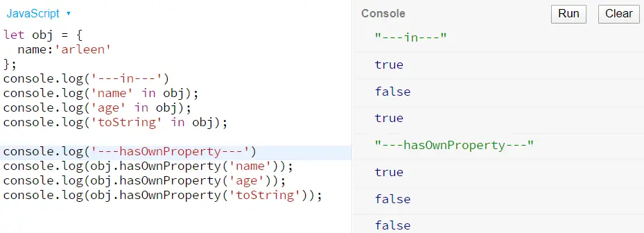 补充:'name' in obj和obj.hasOwnProperty('name') 的区别: