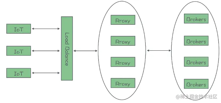 负载均衡器的后面,需要部署一个 Proxy 集群,这个 Proxy 集群承担了三个重要的作用:第一个作用是来承接海量 IoT 设备的连接,第二个作用是来维护与客户端的会话,第三个作用是作为代理,在客户端和 Broker 之间进行消息转发。