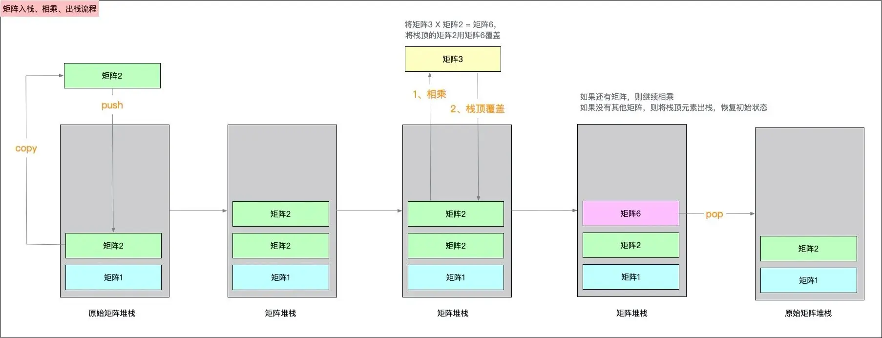 - 如果还有其他矩阵入栈,则继续相乘。