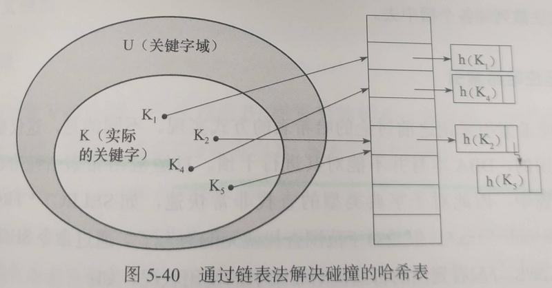 在该表中U表示关键字全集,K表示实际存在的关键字,右边的数组(哈希表)表示在内存中可以直接寻址的连续空间,哈希表中每个插槽关联的单向链表中存储实际数据的真实地址。