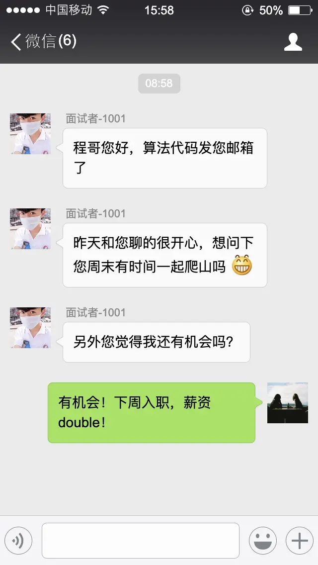 对面的小伙子,我和他从HTTP协议谈到负载均衡,从类的命名规范谈到JVM调优,凡是搬砖用不到的,我们都聊了一遍,相谈甚欢。