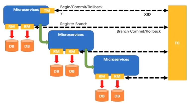 2. 按业务场景,编排数据库,服务等事务内资源(RM向TC汇报资源准备状态)