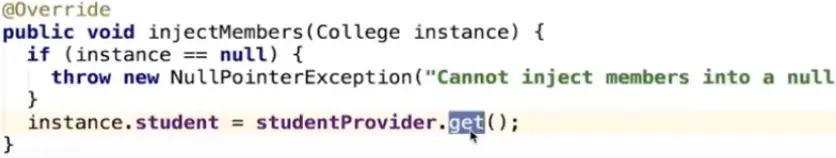 DaggerCollegeComponent.builder().build()中最后调用的是成员注入器College_MembersInjector的create方法,生成成员注入器collegeMembersInjector inject方法的实现 --进入injectMembers --这里get()的最终实现在工厂类的get()方法中生产(new)Student对象