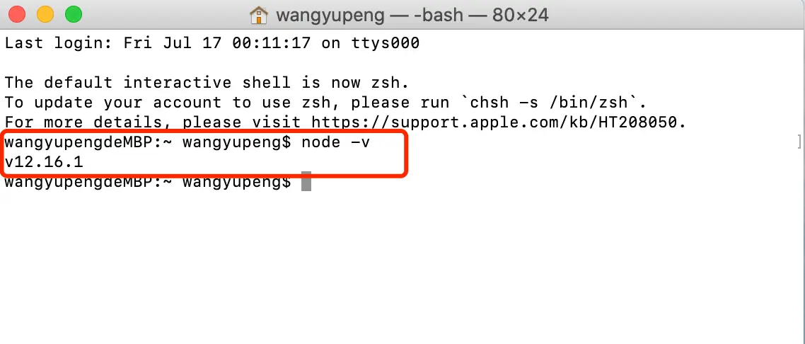 1、在开始之前我们需要确保你的本地是由nodejs的环境,我们先来验证一下, 打开的命令行工具,我的是mac所以打开的终端(Windows打开cmd),输入一下命令: