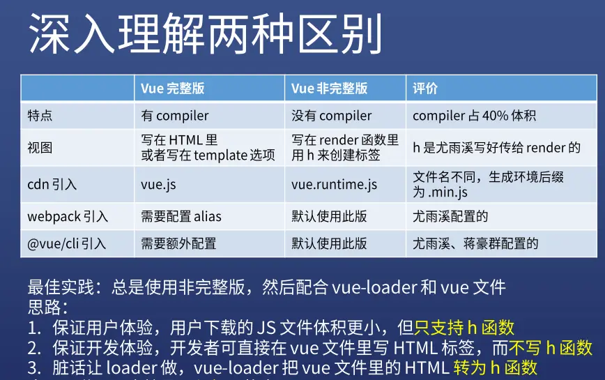 - render是非完整版常用的,常把视图写在rander函数中,用h来创造标签,templete的内容放在vue文件中,vue-loader可以把内容被转换成