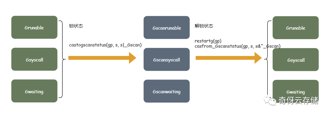 scanstack; - 重启 goroutine 状态,去掉 Gscan 状态标识;