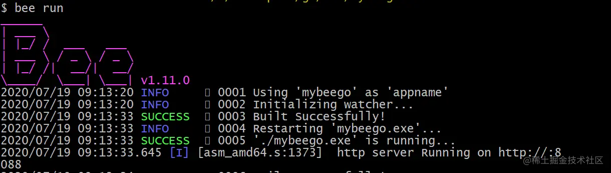 刚开始以为Go语言的环境安装问题,可是通过bee run命令启动项目,是可以启动的,如图: