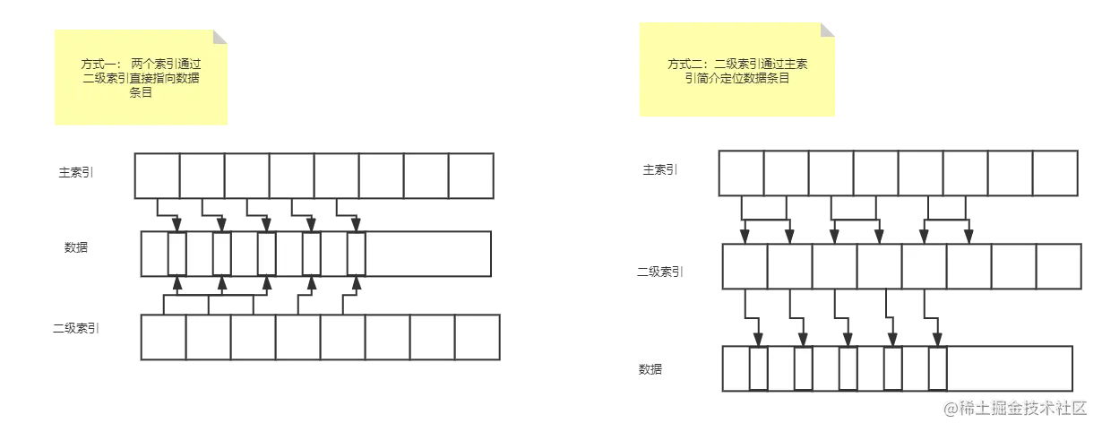 如果像第一种方式:通过主索引和二级索引直接指向数据条目,那么每当数据库出现写操作的时候,要遍历主索引去获取新的数据文件偏移量。这样一来不仅主索引的指针需要需要频繁移动,二级索引自身也要移动指针到新的磁盘块,每次磁盘寻道次数会损耗IO性能。 所以像mysql的innodb引擎选择了第二种寻址方式,每次偏移量更新,会通知主索引,这样只需要维护二级索引就可以了