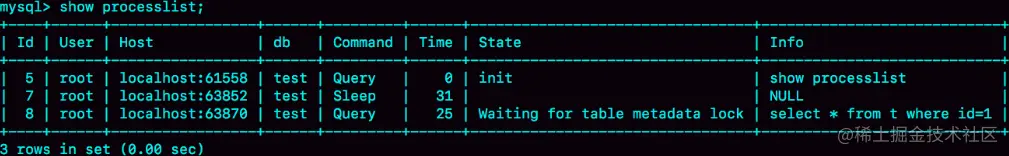 出现这个状态 Waiting for table metadata lock 表示的是,现在有一个线程正在表 t 上请求或者持有 MDL 写锁,把 select语句堵住了。 这类问题的处理方式,就是找到谁持有 MDL 写锁,然后把它 kill 掉。 但是,由于在 show processlist 的结果里面,session A 的 Command 列是“Sleep”,导致查找起来很不方便。不过有了