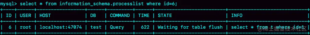 select * from information_schema.processlist where id=1;Waiting for table flush 这个状态表示的是,现在有一个线程正要对表 t 做 flush 操作。MySQL 里面对表做 flush操作的用法,一般有以下两个: