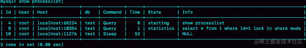 select * from t where id=1; 查询结果长时间不返回。一般碰到这种情况的话,大概率是表 t 被锁住了。接下来分析原因的时候,一般都是首先执行一下 show processlist 命令,看看当前语句处于什么状态。