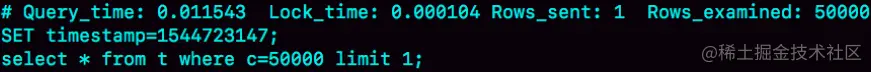 由于字段 c 上没有索引,这个语句只能走 id 主键顺序扫描,因此需要扫描 5 万行。作为确认,你可以看一下慢查询日志。