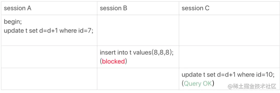 所以,session B 要往这个间隙里面插入 id=8 的记录会被锁住,但是 session C 修改id=10 这行是可以的。