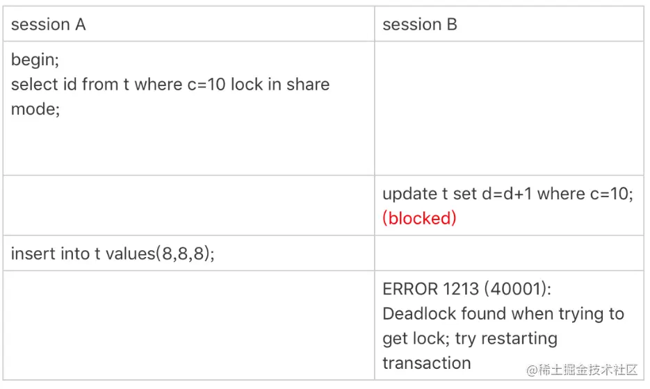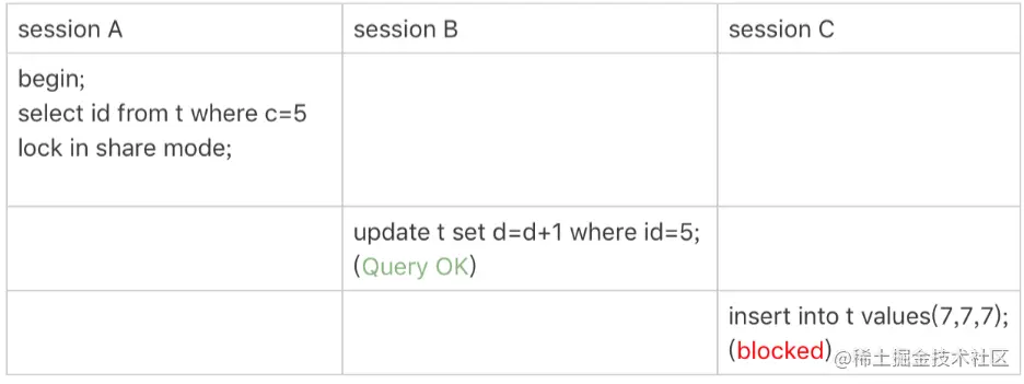 这个例子说明,锁是加在索引上的;同时,它给我们的指导是,如果你要用 lock in sharemode 来给行加读锁避免数据被更新的话,就必须得绕过覆盖索引的优化,在查询字段中加入索引中不存在的字段。比如,将 session A 的查询语句改成 select d from t wherec=5 lock in share mode。
