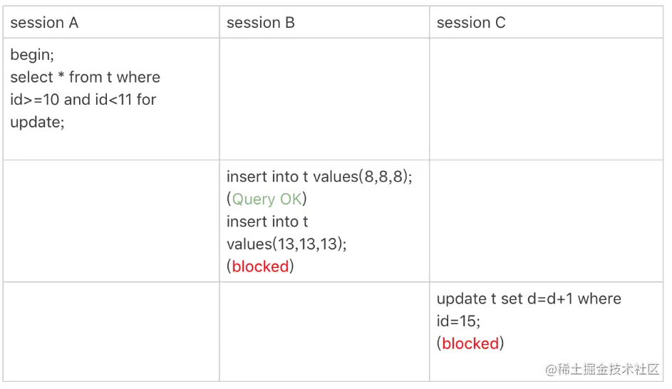 所以,session A 这时候锁的范围就是主键索引上,行锁 id=10 和 next-keylock(10,15]。这样,session B 和 session C 的结果你就能理解了。