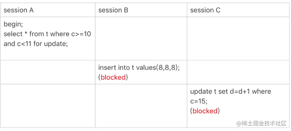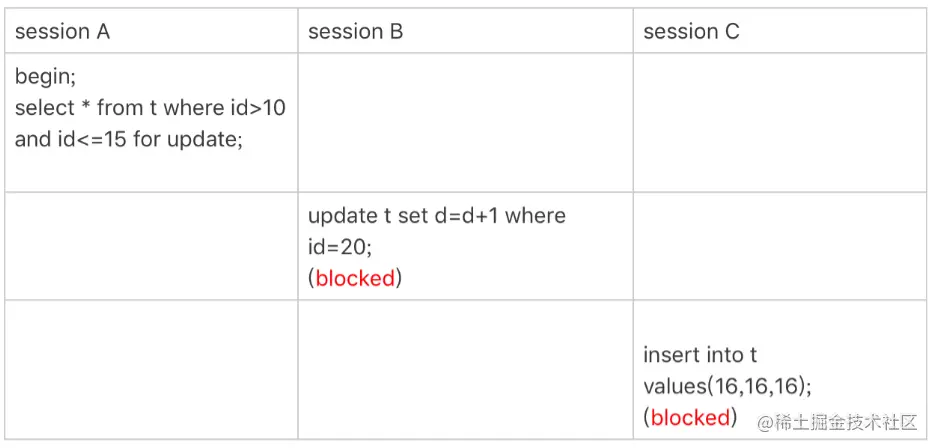 所以,session B 要更新 id=20 这一行,是会被锁住的。同样地,session C 要插入 id=16 的一行,也会被锁住。