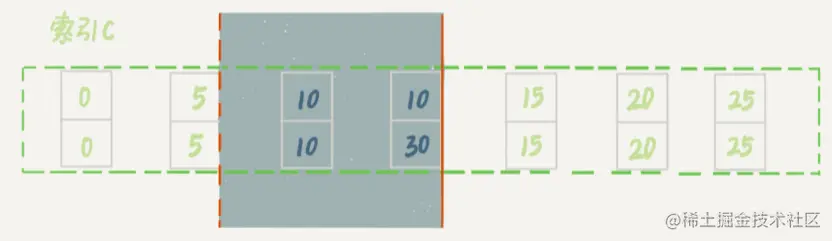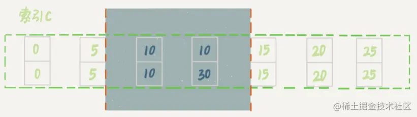 可以看到,虽然有两个 c=10,但是它们的主键值 id 是不同的(分别是 10 和 30),因此这两个 c=10 的记录之间,也是有间隙的。图中我画出了索引 c 上的主键 id。为了跟间隙锁的开区间形式进行区别,我用(c=10,id=30) 这样的形式,来表示索引上的一行。